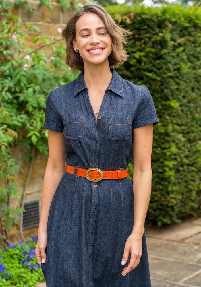 Add a eye catching splash of colour with our orange crocodile-embossed belt. It is made from high-quality Italian cowhide leather and has a mid-scale croc texture and a polished finish. It comes with a simple gold detachable buckle, but works equally well with silver. The stitching and edge colour are closely matched for a clean, tonal look. Available in 40mm width too.