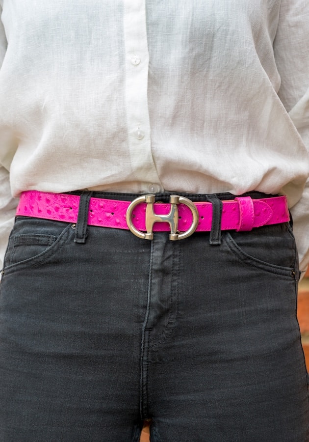 A bright pink belt is a brilliant accessory and adds a real flash of colour to an outfit. Made from fabulous Italian leather that is embossed with the ostrich print, this is a must have belt for those pink lovers out there. A diamante buckle – a silver or a gold classic design will all look great on this belt.