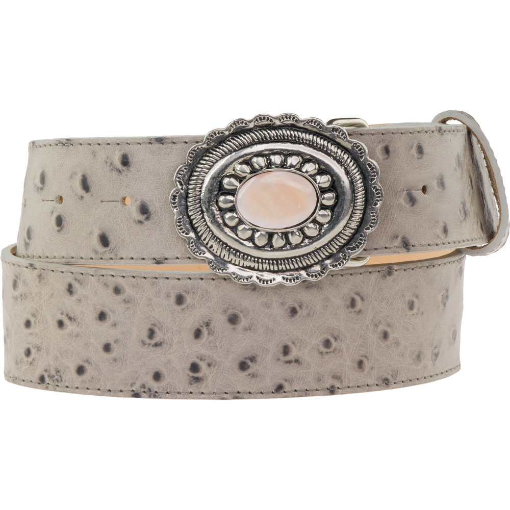 This buckle has been very successful with the turquoise stone and so we have had a pink mother of pearl gemstone put in for spring to work with the pink belts and paler spring colours. It looks really pretty on the sand leather and white ostrich, and would be a good addition to you belt and buckle range.