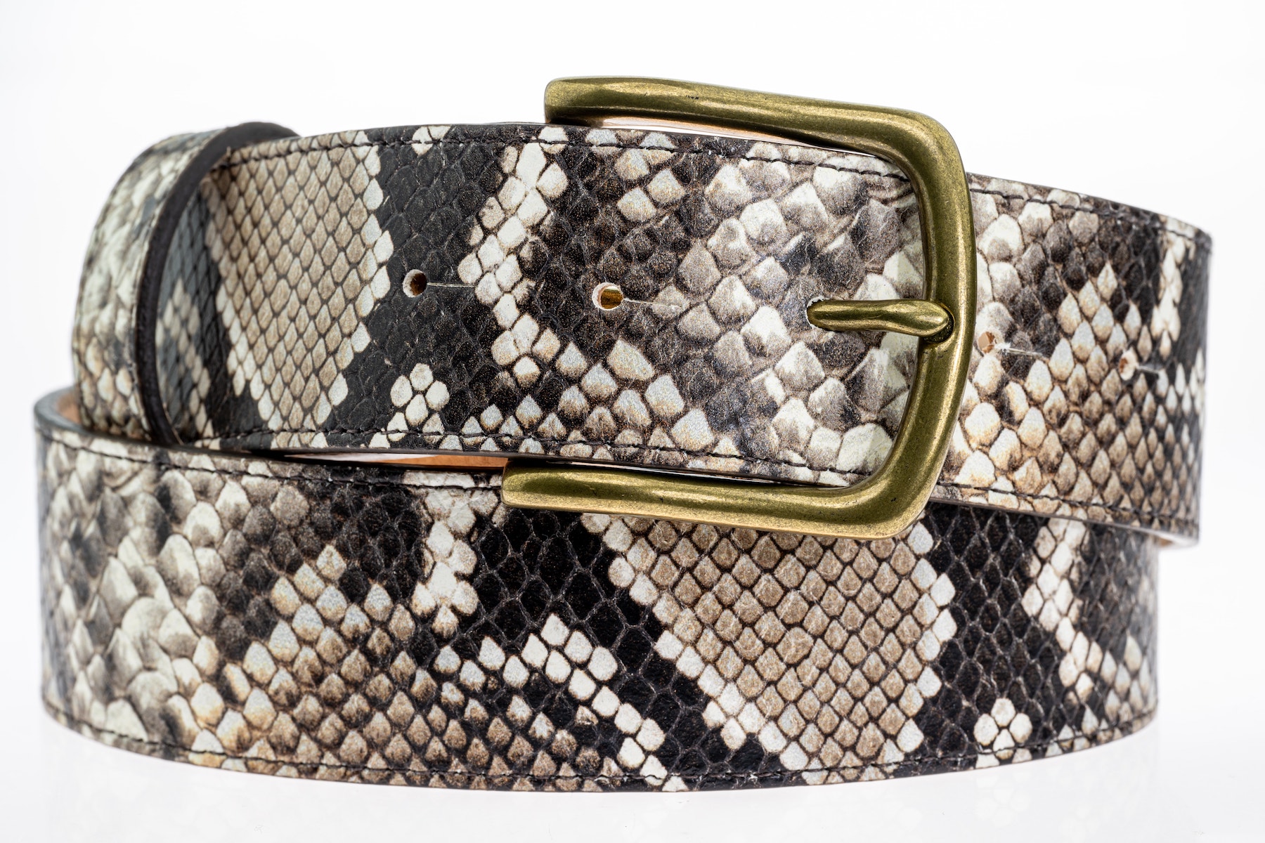 We have a new brown mock python print belt and we are delighted with it – this cowhide skin has been specially designed for Peachy Belts as we wanted a great mix of brown tones and cream to give contrast.  This leather has a surface that is hand cut and textured and a semi shine finish.  Python print adds lustre to any outfit, giving it some edginess and interest when you are wearing simple colours.  We picked brown stitching and edge paint to finish it off, and it works with gold or silver buckles.