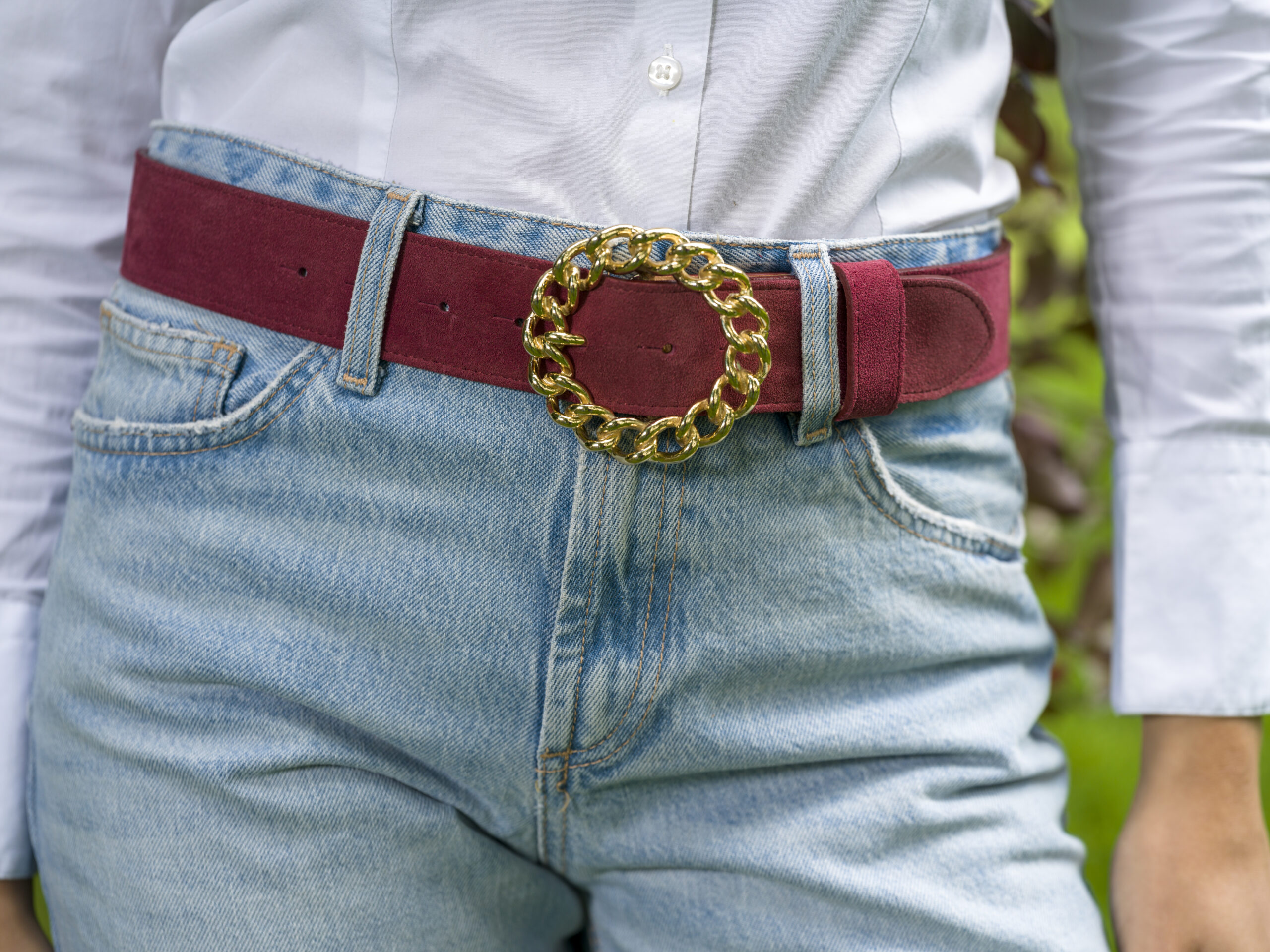 Channel are famous for their chain design, and we took a chunky piece of chain and put it into a mould – then it was shaped and sealed, and now we have the perfect circle that is made from solid pewter and then plated with 18 carat gold.  The central bar of the buckle is wide enough that the edges of the belt do not get scuffed when you do it up.  A great everyday style that can be worn on any colour of belt.  A classic style that you will not tire of and will use for many years.